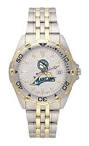 Stylish brushed chrome finish case with a rotating two-tone bezel and matching two-tone stainless steel bracelet. The All-Star watch features a precision Miyota quartz movement distinguished dial face with the Florida Marlins logo on the top half and Florida Marlins name on the lower half of the dial date window raised luminous hour marks with minute and second hands and the crystal is mineral glass. Water resistant. Packaged in an attractive silver tin. Two year limited warranty.[]